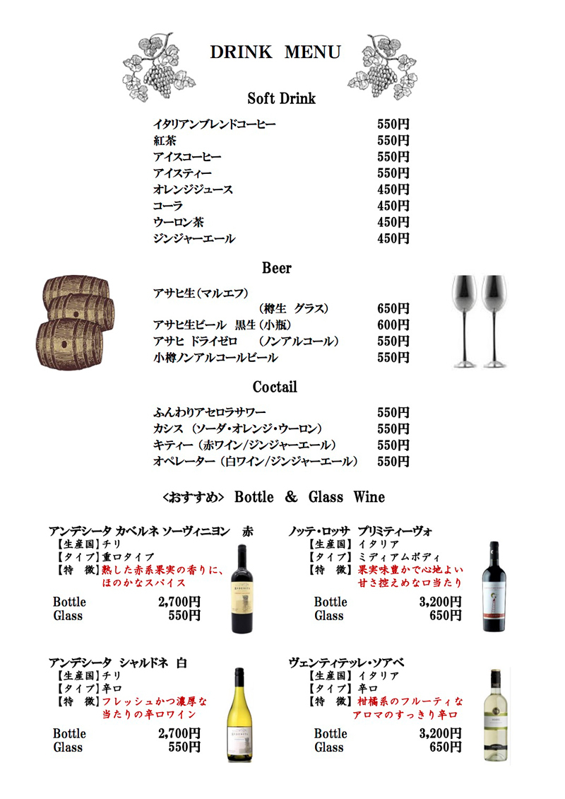 イタリア、フランスを中心にシェフおすすめのワイン(グラス、ボトル)もぜひお試し下さいね。
